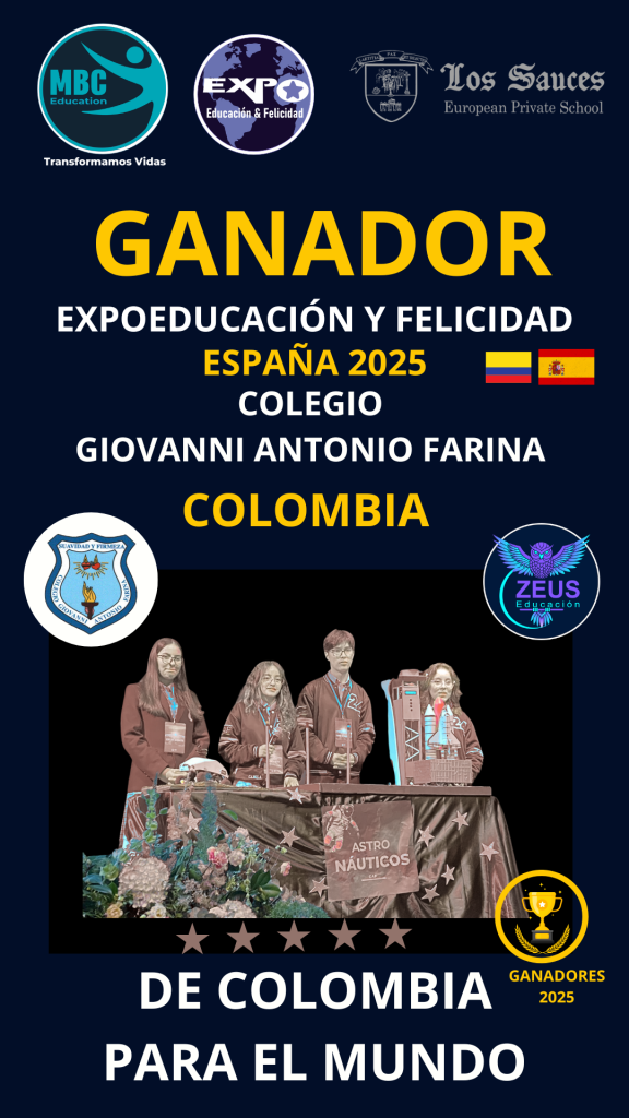 Nos llena de orgullo anunciar que el Colegio Giovanni Antonio Farina de Colombia ha sido reconocido como GANADOR en Expoeducación y Felicidad 2025, España, un evento organizado por MBC Education y Zeus Educación, con el respaldo del Colegio Los Sauces – European Private School.